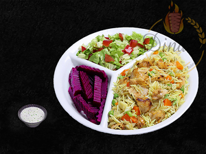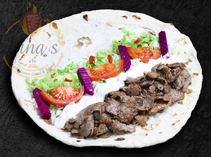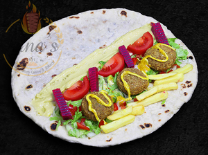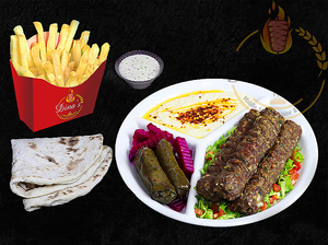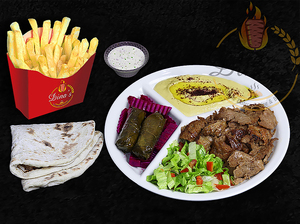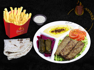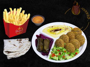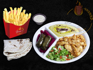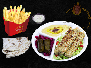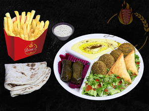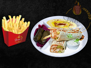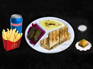 Any sandwich served with hummus, dolmas, pickles, fries, your choice of sauce, a piece of dessert plus a drink of your choice.