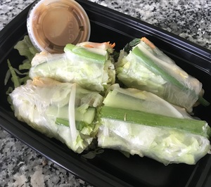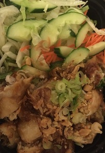Vermicelli aka bun (thin rice noodle) served over salad (lettuce, cucumber, carrot, bean sprout, mint, onion, roasted peanut) with sweet & sour dressing.