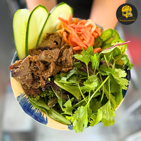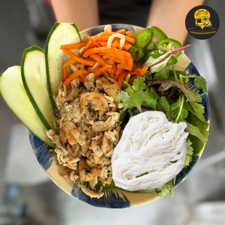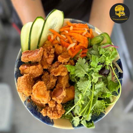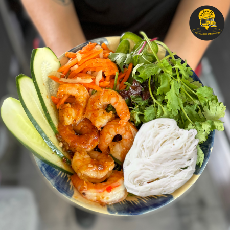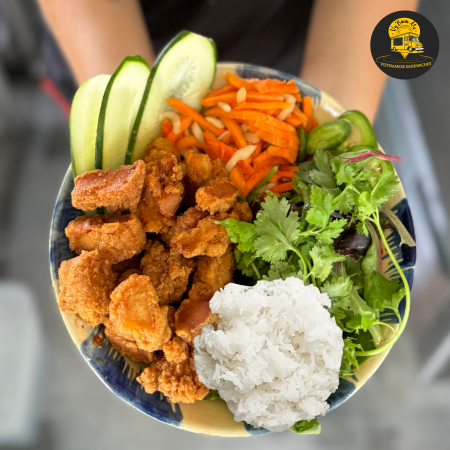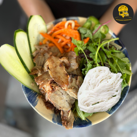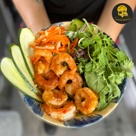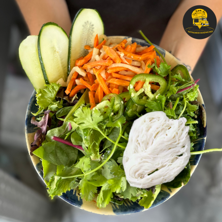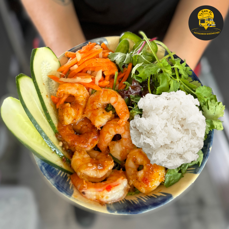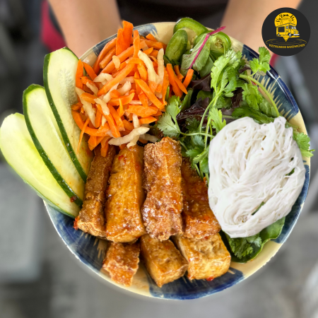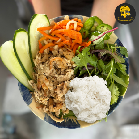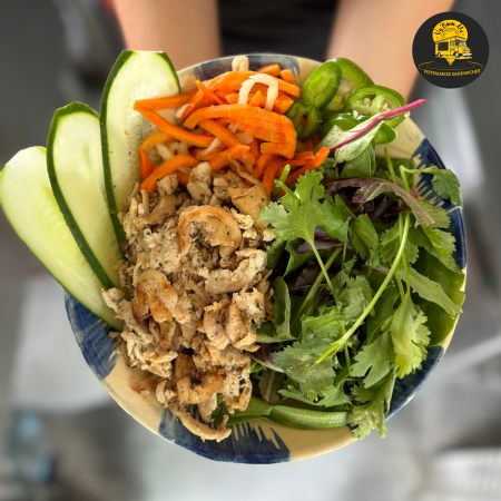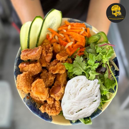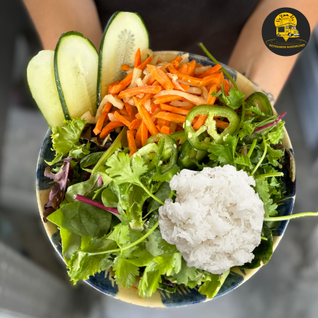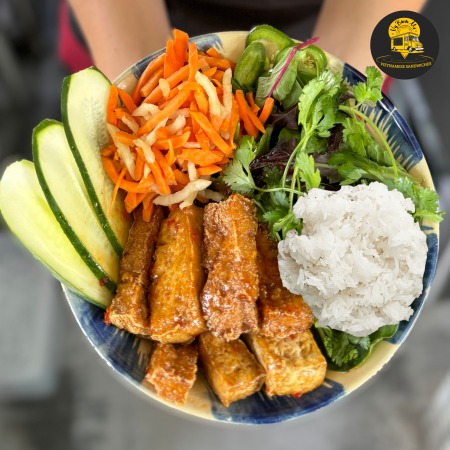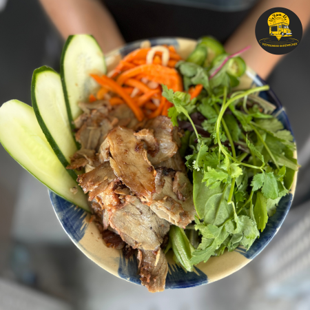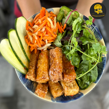 Freshness in every bite! Choose your protein and enjoy a vibrant mix of spring greens, crunchy pickled carrots and daikons, refreshing cucumber, zesty cilantro, and a touch of heat from jalapeno. Drench it all in our signature garlic fish sauce or peanut sauce for a flavor explosion!