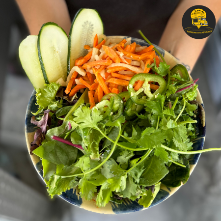 Freshly Made Baguette, Homemade Mayo, Pate (cold cut only) Cucumber, Cilantro, Pickled Carrots, Pickled Daikons, Jalapeno.
