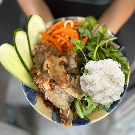 Light, refreshing, and packed with flavor! Enjoy your choice of protein atop a bed of cool vermicelli noodles, topped with fresh vegetables and your choice of garlic fish sauce or peanut sauce.