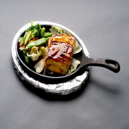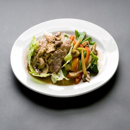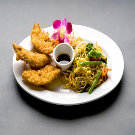 With your choice of french fries, onion rings, white rice, steamed rice noodles, steamed tri color veggies